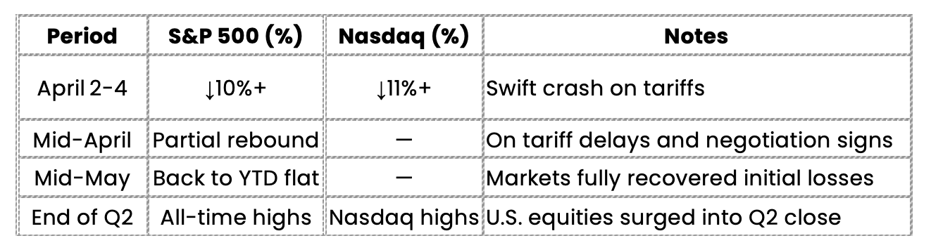 Q2 2025 was a rollercoaster: a swift, deep drawdown triggered by Trump’s tariff surge, followed by a resilient rebound as policy softened, and closed with equities at fresh highs. The episode reinforced that while headlines can trigger violent market swings, fundamentals and investor conviction ultimately reassert control.